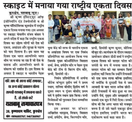 An Essay Writing Competition was successfully organized at Shri Krishan Institute of Engineering & Technology (SKIET), Kurukshetra and Shri Krishan Polytechnic (SKP) on the occasion of National Unity Day (Ekta Diwas), in association with Nehru Yuva Kendra (Govt. of India).